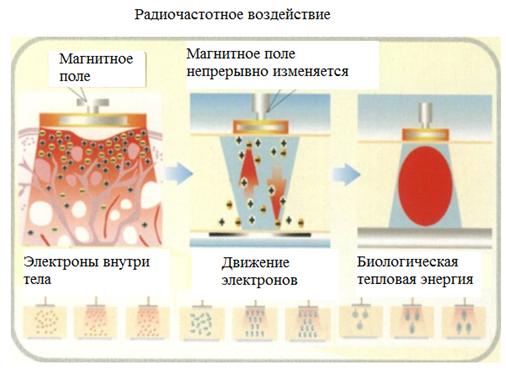 РЧ технология быстро меняет электрическую полярность поля, которое поочередно привлекает и отталкивает электроны и заряженные ионы в дерме и подкожной клетчатке. Из-за непрерывного движения естественное сопротивление ткани (импеданс) производит тепло. Тепловой эффект влияет на дерму, что приводит к стимуляции выработки коллагена и активации клеток фибробластов. За сокращением естественной выработки коллагена клетками кожи следует выработка нового коллагена в течение длительного периода времени. Так как токовые импульсы не проникают сквозь эпидермис, поверхность кожи не подвергается воздействию тепла, поэтому не требуется охлаждение ее поверхности. РЧ технология применяется для устранения морщин, улучшения овала лица и борьбы со следами старения.