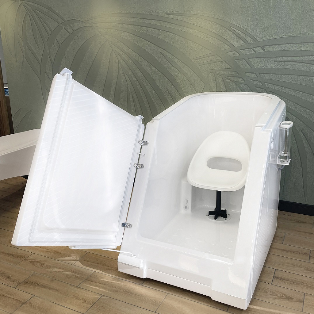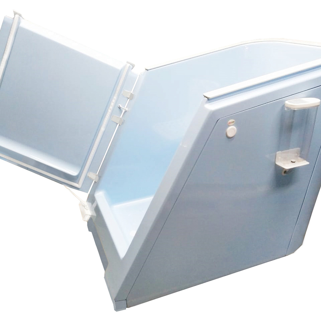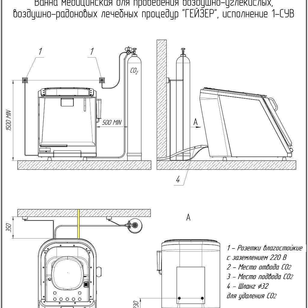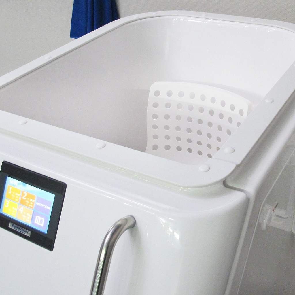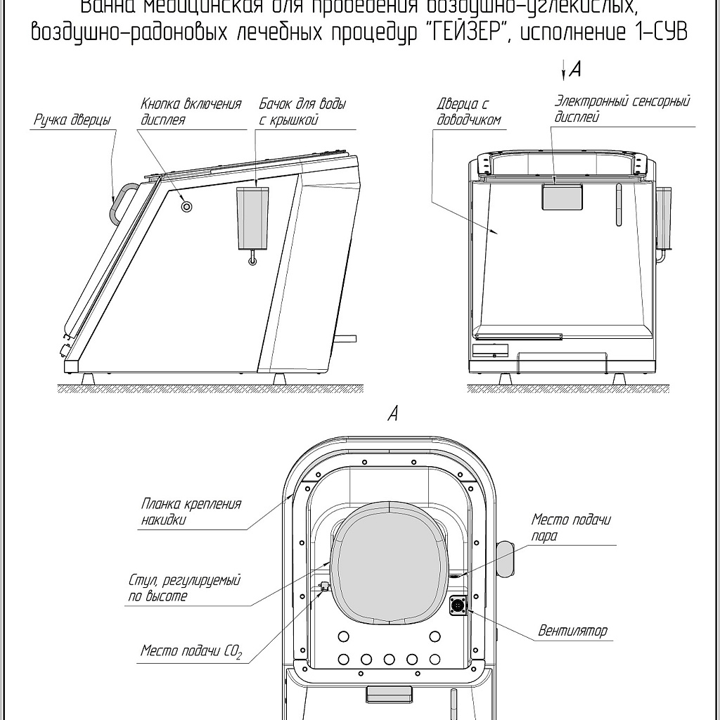 Сухая углекислая ванна Гейзер предназначена для лечения и профилактики различных заболеваний с помощью воздействия на организм углекислого газа в разной концентрации. Во время отпуска процедуры пациент размещается сидя, в специальной герметичной ванне с дверцей, сверху ванна закрывается плотной мембраной с отверстием для головы, пространство вокруг шеи мягко обхватывается манжетой, предотвращая попадание углекислого газа из аппарата. Таким образом пациент дышит обычным воздухом, а газ остается только внутри ванны.